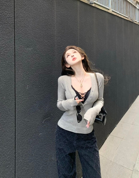 Jan. Idol 天菜 聖誕跨年多色選 V領針織彈力修身上衣 橘粉/灰