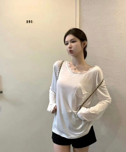 Jan. 悠然純欲 蕾絲拼接口袋大挖背打底上衣 白