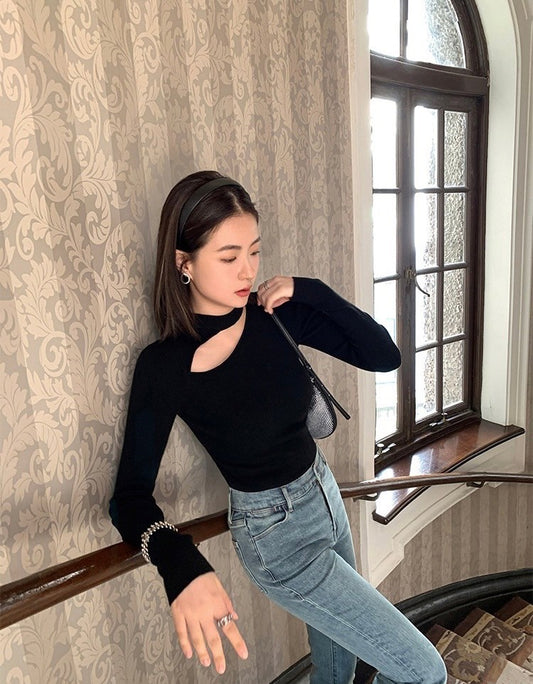 Jan. 經典基礎打底 不規則縷空鎖骨領上衣 黑
