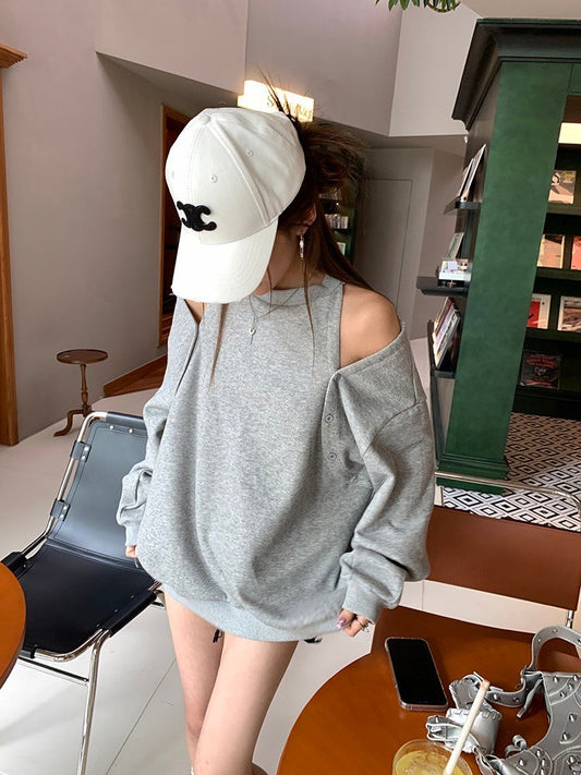 Aug. 韓女心機 露肩設計鈕扣長袖衛衣 灰色