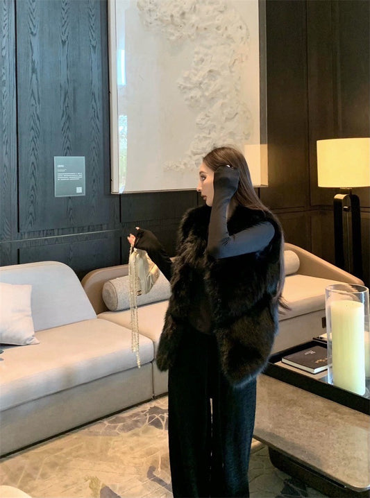 Dec. 氣質溫柔 環保皮草馬甲外套 打底顯瘦上衣 印花休閒褲 黑