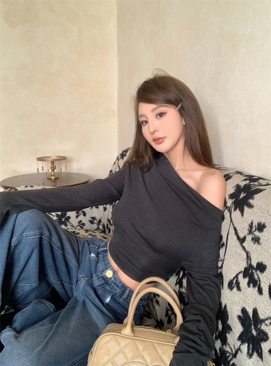 Mar. 休閒高智系 斜肩彈力修身短款長袖上衣 灰色