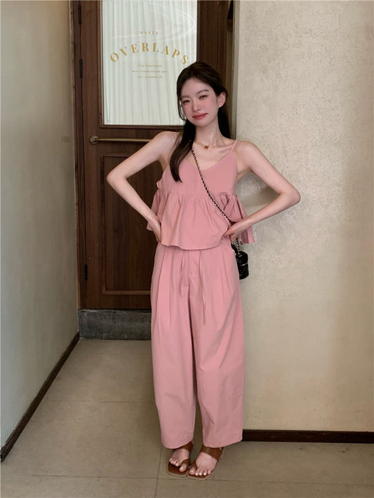 Jul. 慵懶整套 粉色櫻花v領背心 闊腿休閒褲