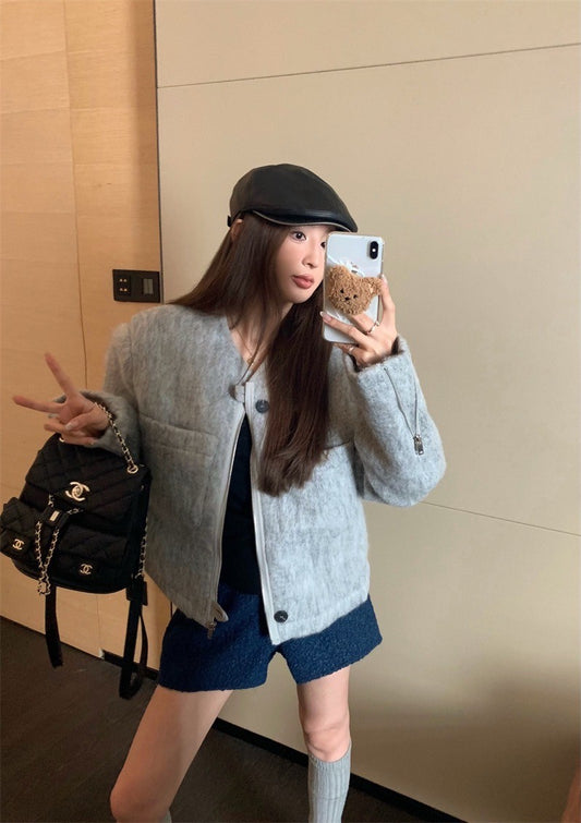 Aug. 經典粗呢編織亮片細粉棒球外套 藏青