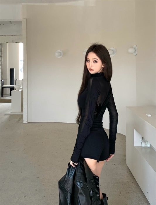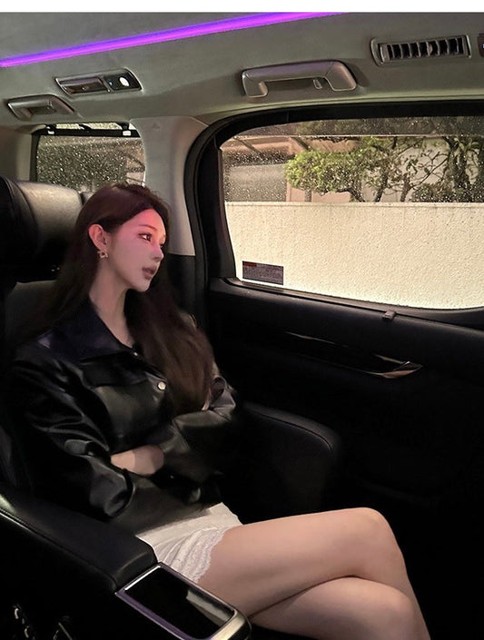 Jan. 美式辣妹 漆皮單排扣皮外套 透視感打底黑色上衣 顯瘦黑短褲