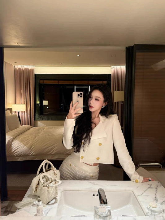 26Jan. 復古千金法式奢華雙排金釦針織外套 黑/白