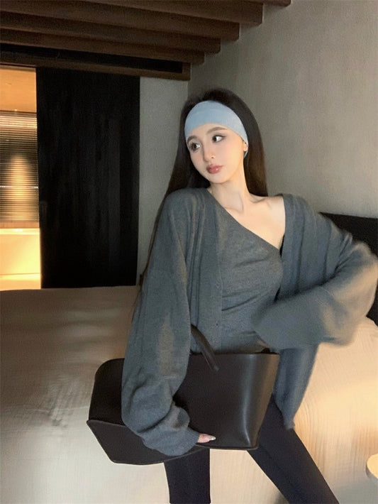 Oct. 美式休閒2件套 斜肩針織背心 外套 深灰