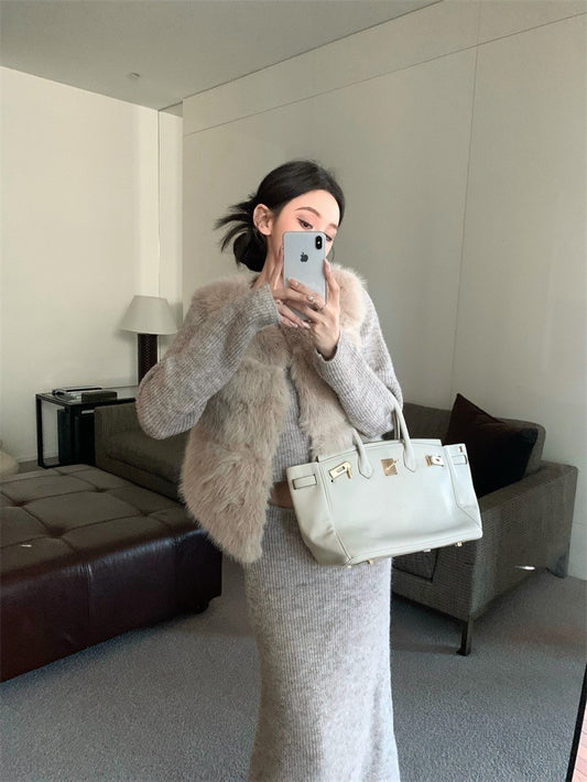 Jan. 氣質貌美 溫柔正肩修身針織上衣 魚尾半身裙 同色系仿貂馬甲 燕麥色