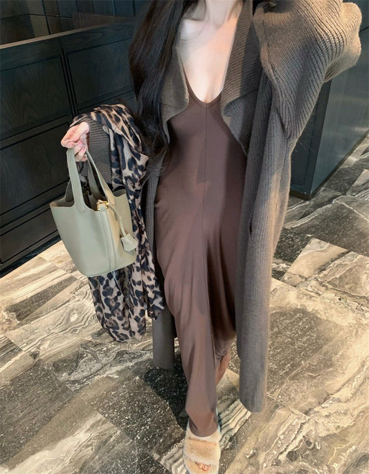 Jan. 冬款設計剪裁針織長款咖色外套 咖色V領抓皺連身裙