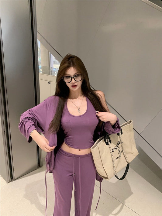 Aug. 懶人三件套 寬鬆顯瘦綁帶外套 口袋背心 抽繩微喇叭褲 紫