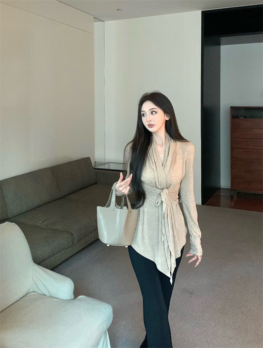 May. 氣質疊領綁帶長袖開衫 杏 高腰微喇叭黑色休閒褲
