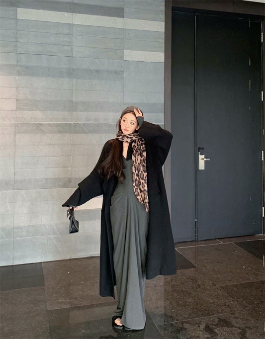 Jan. 冬款設計剪裁針織長款黑色外套 灰色V領抓皺連身裙