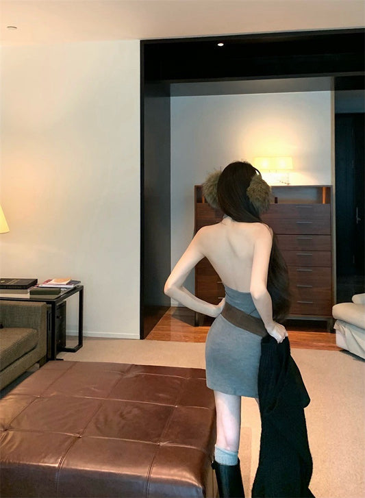 Jan. 復古辣妹 歐美削肩挖背顯瘦連身裙 慵懶針織開衫