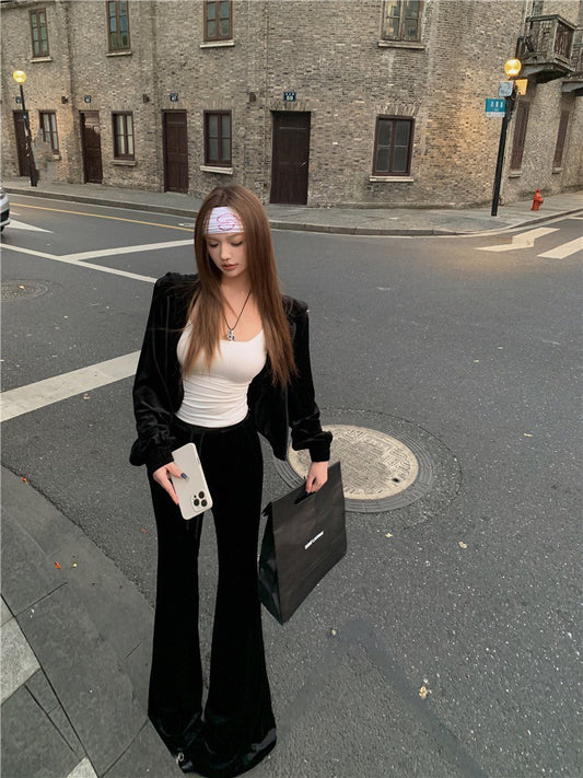 May. 復古disco 休閒黑色絲絨連帽外套 微喇叭休閒褲