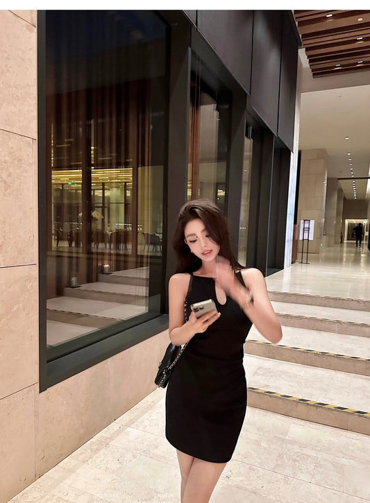 Aug. 辣妹金鍊不規則縷空修身黑上衣 黑色顯瘦包臀裙