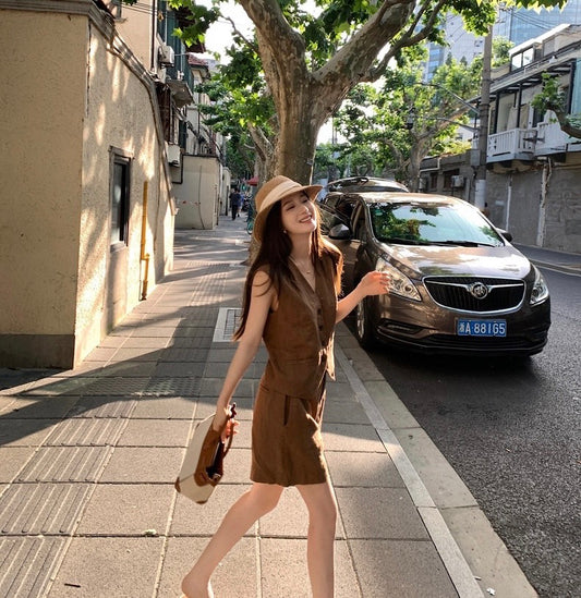 Aug. 老錢亞麻套裝 簡約百搭V領排扣短褲套裝 咖色