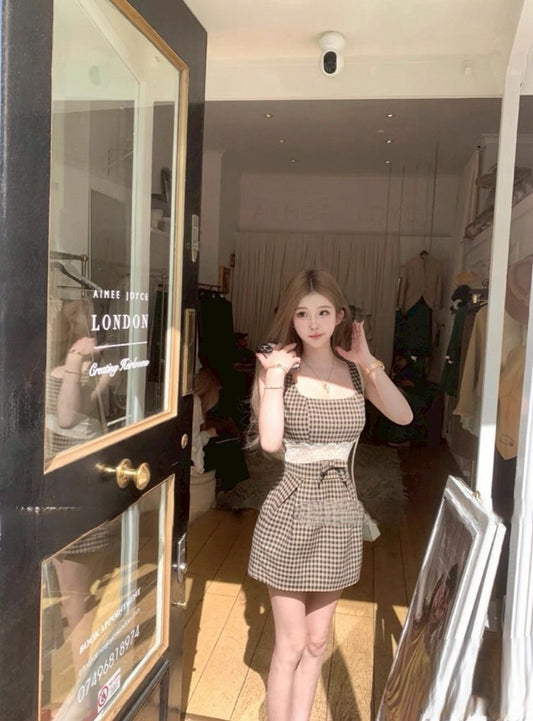 Jun. 復古畫報 格紋方領蕾絲收腰小洋裝