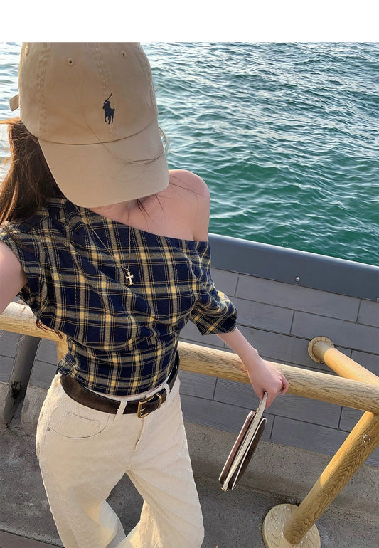 Sep. 休閒百搭 針織螺紋針織斜肩彈力上衣 白 顯瘦低腰牛仔短褲
