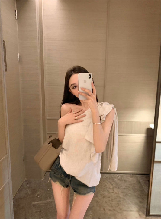Oct. 氣質女孩 斜領領結垂墜修身上衣 牛仔鬚邊短褲