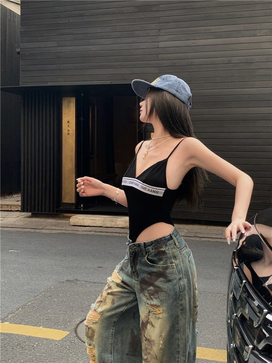 Sep. 歐美辣妹 銀釘挖肩顯瘦彈力背心 灰