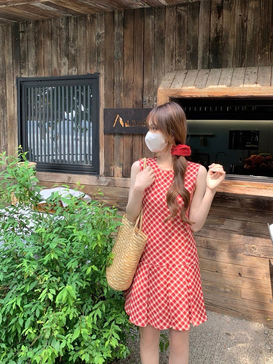 Aug. 草莓野餐 紅白格紋拼接百摺連身裙