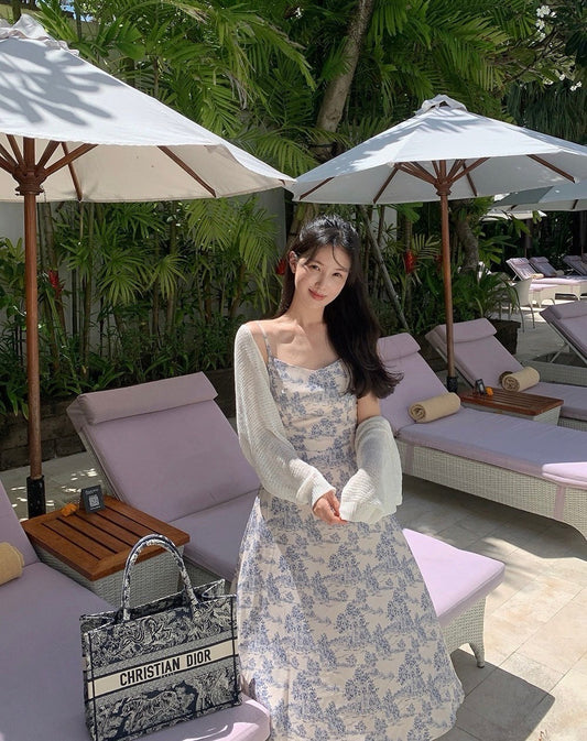 Aug. 清新古典優雅印花 收腰吊帶洋裝