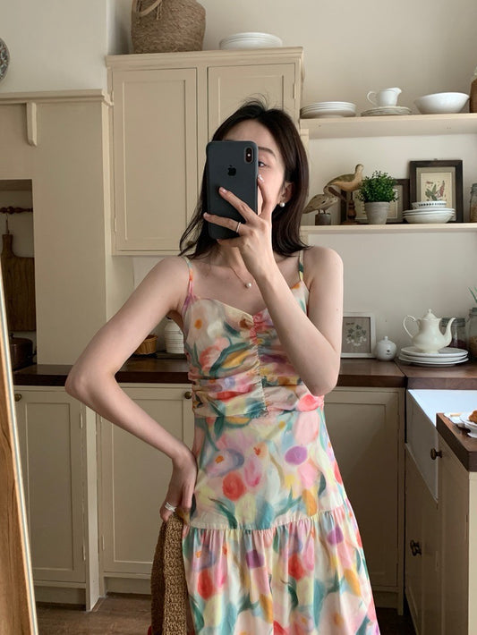 Aug. 花園油畫小畫家 抓皺V領收腰細肩帶長裙洋裝