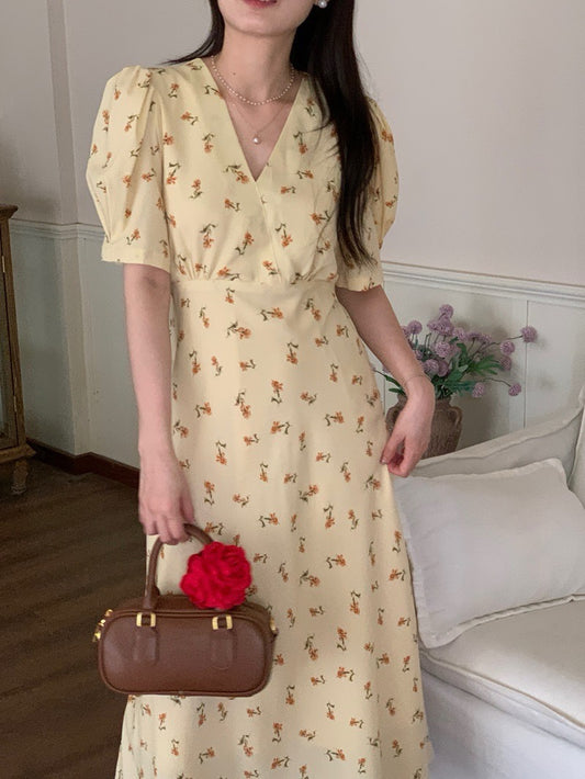 Aug. 韓國歐膩最愛 氣質顯白奶黃碎花連衣裙
