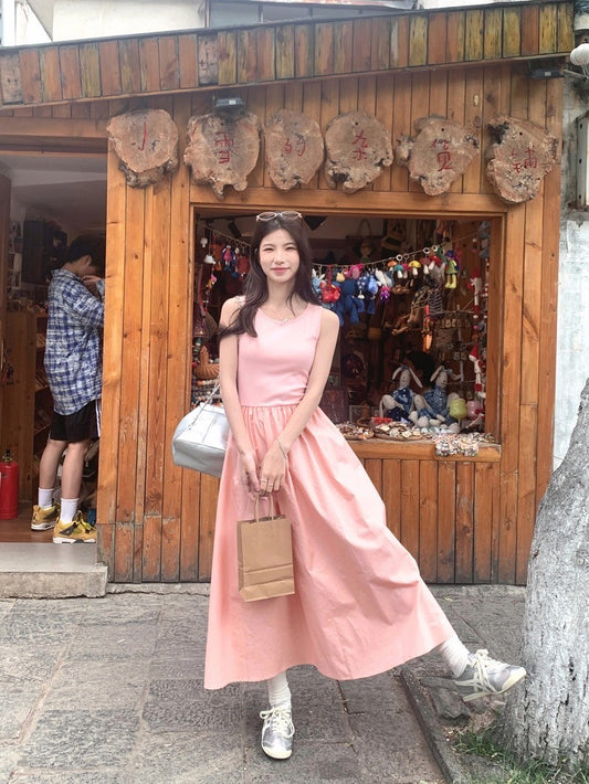 Aug. 優雅日常通勤 背心拼接連身裙 粉色