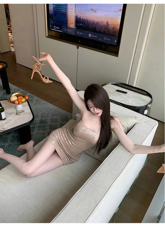 Apr. 人魚綺夢 香檳粉色亮片綁帶抹胸連身裙