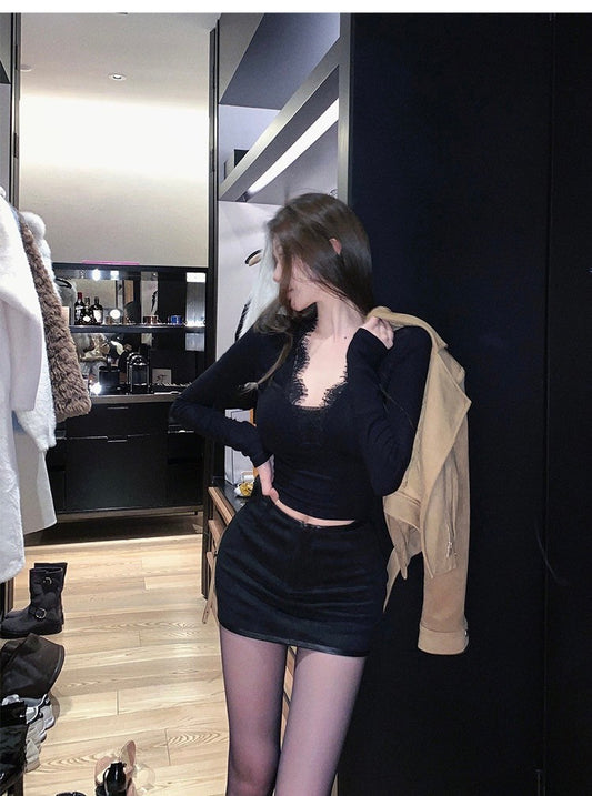 Dec. 嬌欲私藏 蕾絲拼接V領磨毛長袖打底上衣 黑