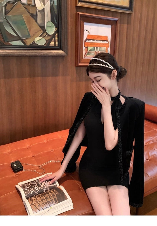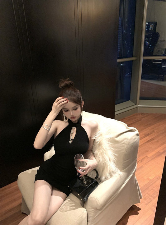 Dec. 獨閃晚宴 V領掛脖美背顯瘦羊絨包臀裙 黑