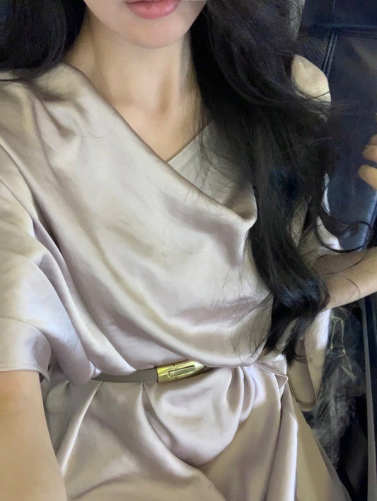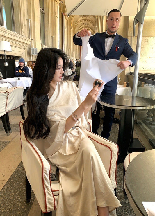 Dec. 中東貴婦 純色高奢斜肩罩衫 細肩連身裙套裝 米色