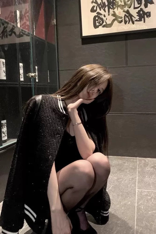 Nov. 復古氣質 翻V領修身打底針織黑上衣 藏藍短褲