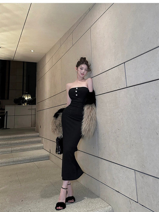 Dec. 晚宴名媛 貴氣優雅收腰抹胸連身裙 黑