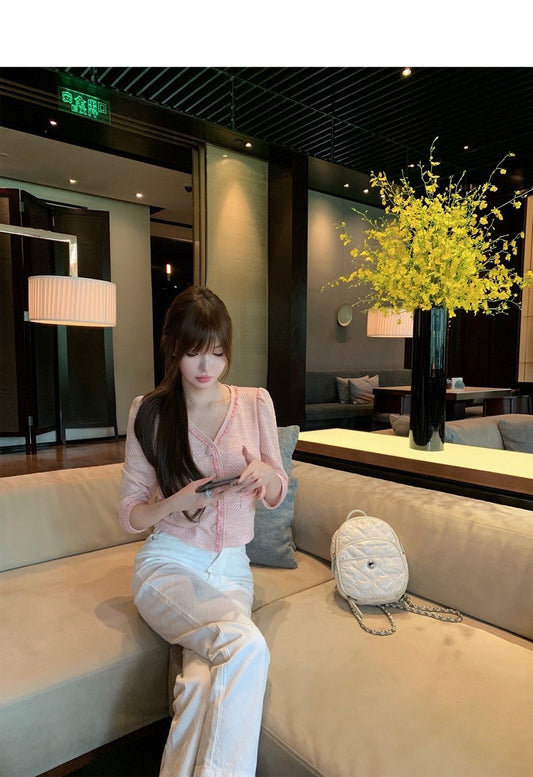 Dec. 輕氧千金 肌理感拼色V領小香外套 粉