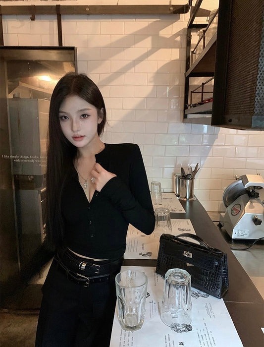 Dec. 直角肩 基礎修身百搭圓領排扣上衣 黑
