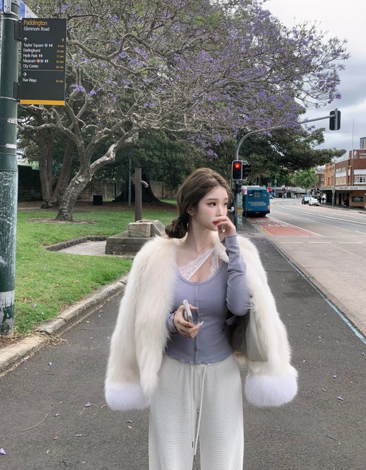 Nov. 田欲捕手 睫毛蕾絲拼接鈕扣U領打底修身上衣 奶杏/芋香紫