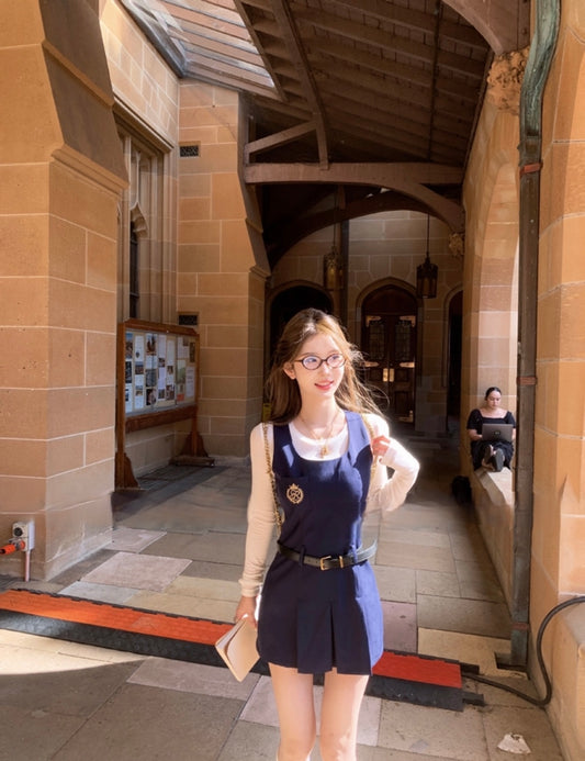 Nov. 心動突擊 學院刺繡深藍吊帶連身裙 上衣套裝