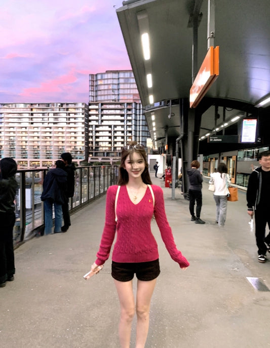 Nov. 伯斯芭比 漿果紅麻花刺繡v領針織上衣
