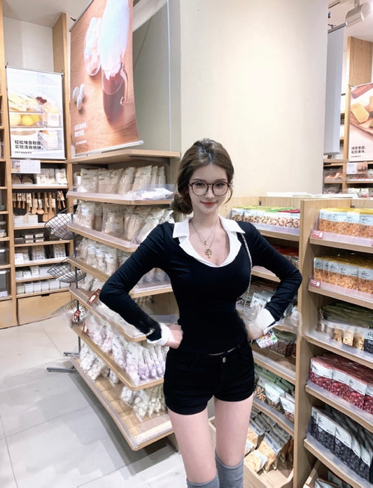 Nov. 韓高優等生 假兩件式拼接純欲襯衫領上衣 黑