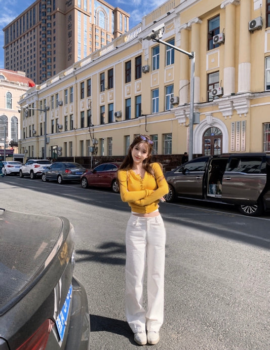 Nov. 奶系學姊 軟呼水滴排扣修身針織外套 小鴨黃