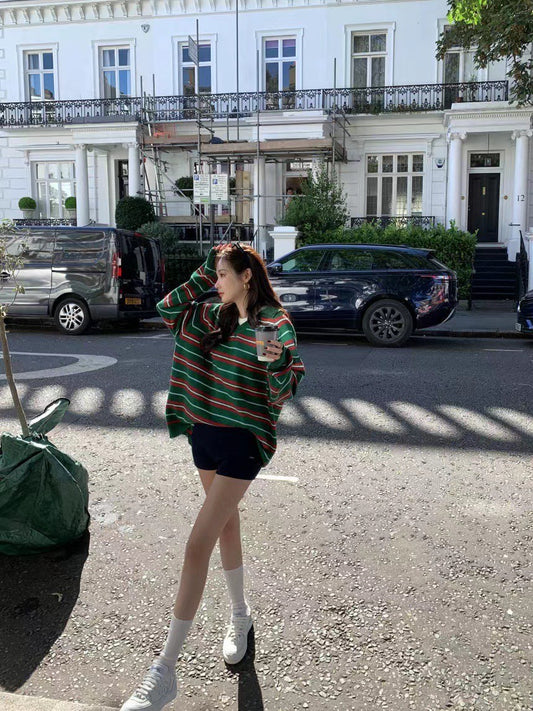 Oct. Old美式 撞色條紋V領針織毛衣 綠紅