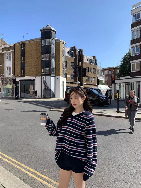 Oct. Old美式 撞色條紋V領針織毛衣 藏藍