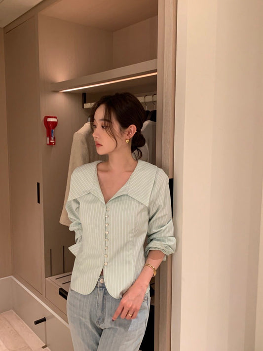 Oct. 復古chic 職場通勤百搭翻領水滴扣修身襯衫 綠