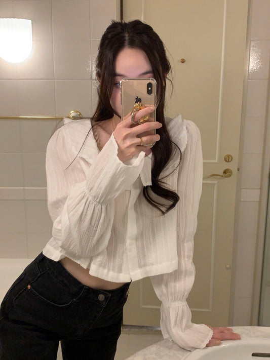 Oct. 日常通勤 氣質荷葉領喇叭袖襯衫上衣 黑/白