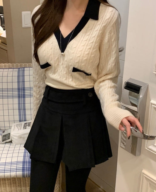 Oct. 俏麗甜心 撞色V領麻花針織長袖上衣 米色/黑色