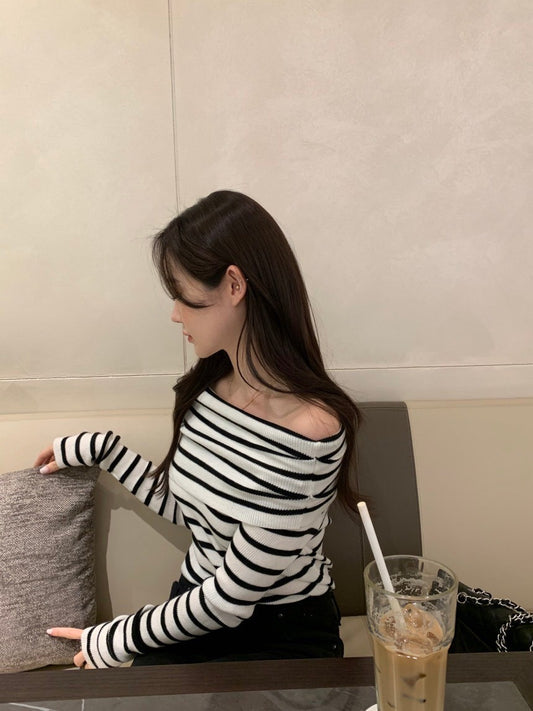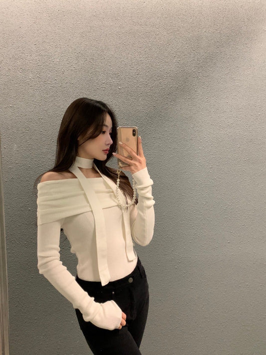 Oct. 一字領彈力翻折針織上衣 白/黑