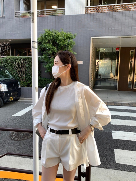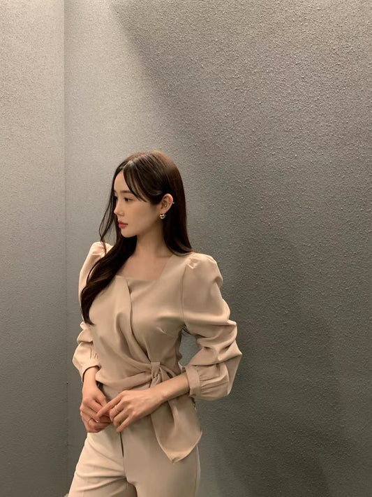 Oct. 氣質泡泡袖方領側腰綁帶上衣 奶卡/黑