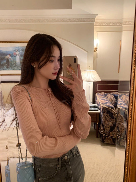Oct. 簡約daily 氣質繫帶過圓領針織上衣 粉/黑